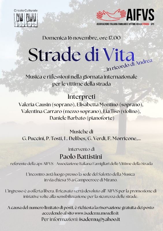 Domenica 16 novembre alle 17.00, presso la sala in via Chiesa 55 a Campocroce di Mirano, il circolo "il Salotto della Musica" propone un pomeriggio di ascolto e riflessione nella Giornata Internazionale per le Vittime della Strada.