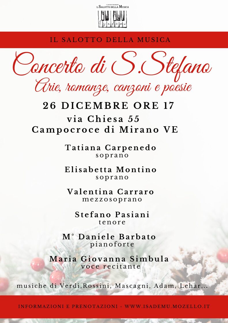 Torna l'atteso concerto di S. Stefano, ormai un immancabile appuntamento offerto dal nostro Salotto della Musica, che vede Valentina Carraro in veste di organizzatrice e cantante. Sarà affiancata dai soprani Elisabetta Montino e Tatiana Carpenedo e dal tenore Stefano Pasiani. Al pianoforte Daniele Barbato. La voce recitante di Maria Giovanna Simbula proporrà la lettura di alcune poesie.
